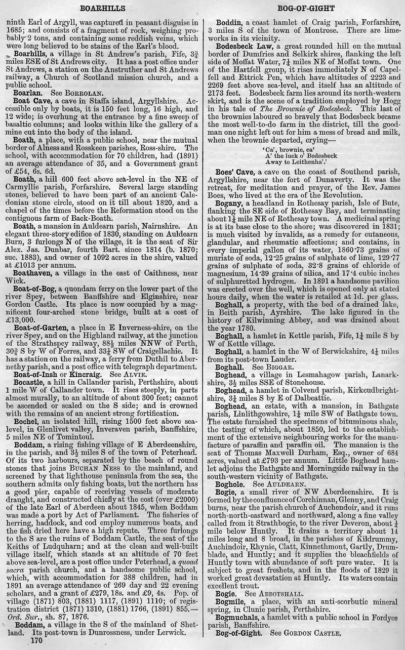 Bocastle, Bochel. Boddam, Boddin, Bodensbeck Law, Boes' Cave, Bogany,