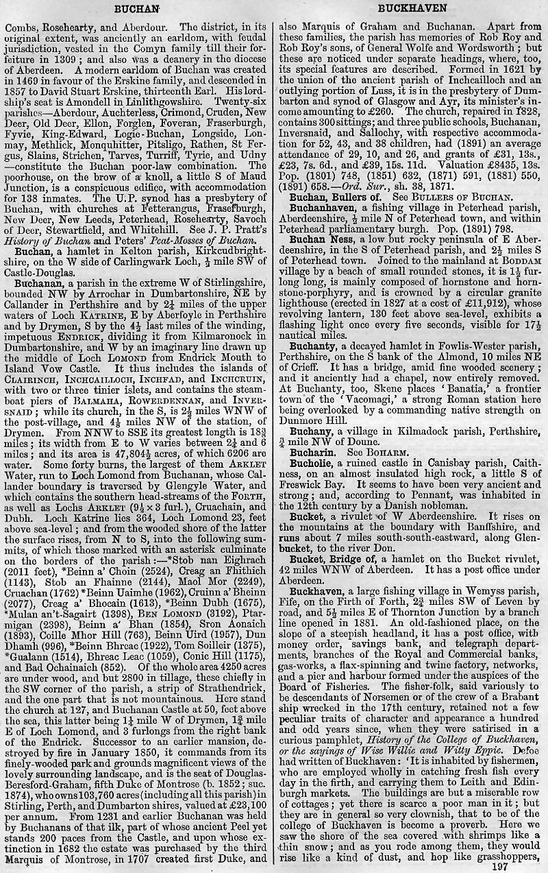 Buchan, Buchanan, Bullers of Buchan, Buchanhaven, Buchan Ness, Buchanty, Buchany, Bucharin, Bucholie, Bucket, Bridge of Bucket, Buckhaven