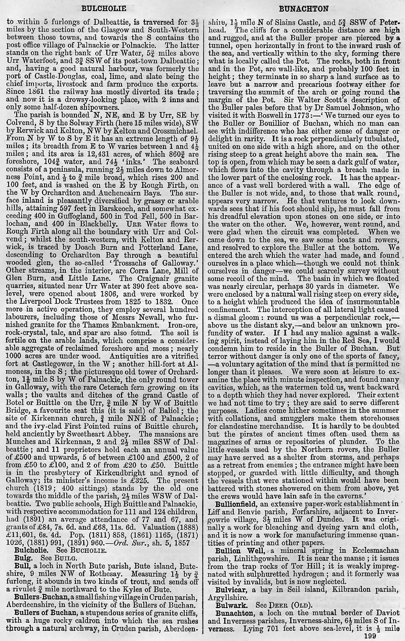 Bulcholie, Bulg, Bull, Bullers-Buchan, Bullers of Buchan, Bullionfield, Bullion Well, Bulvicar, Bulwark, Bunachton