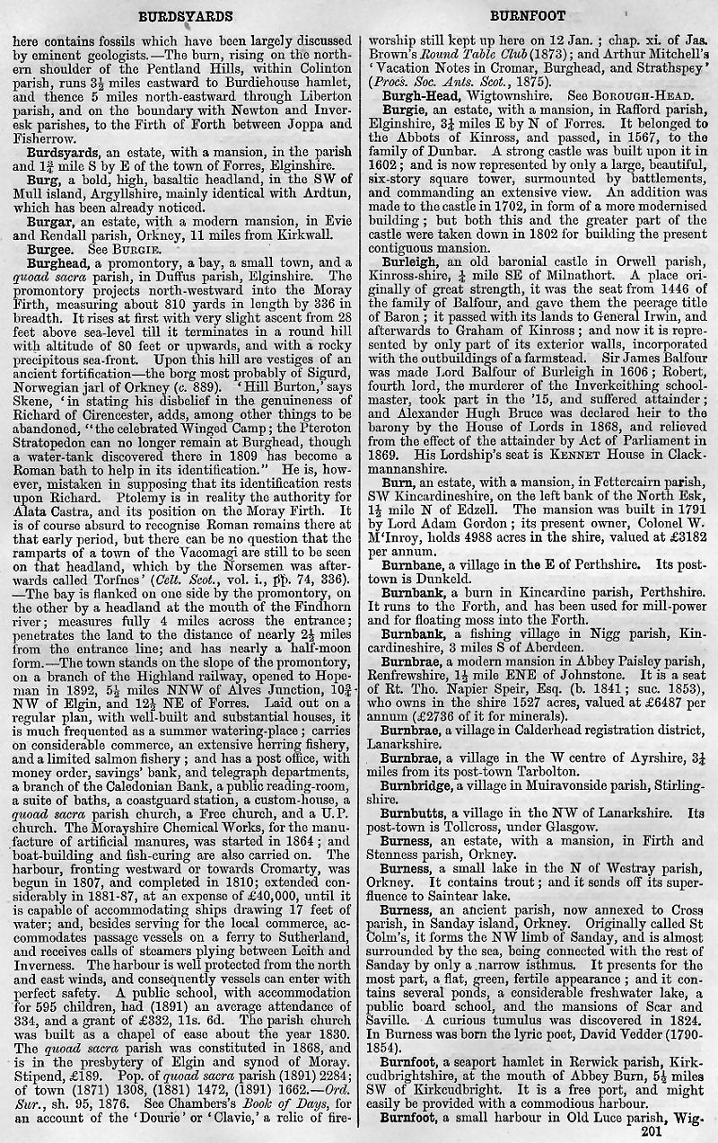 Burdsyards, Burg, Burgar, Burgee, Burghead, Burgh-Head, Burgie, Burleigh, Burn, Burnbane, Burnbank, Burnbrae, Burnbridge, Burnbutts, Burness, Burnfoot