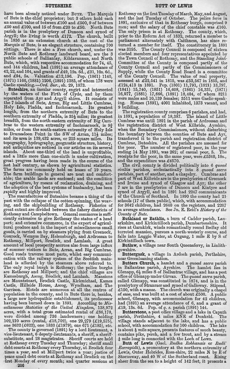 Buteshire, Buthland or Bathlin, Butlaw, Buttergask, Butters Church, Butterstone, Butt of Lewis