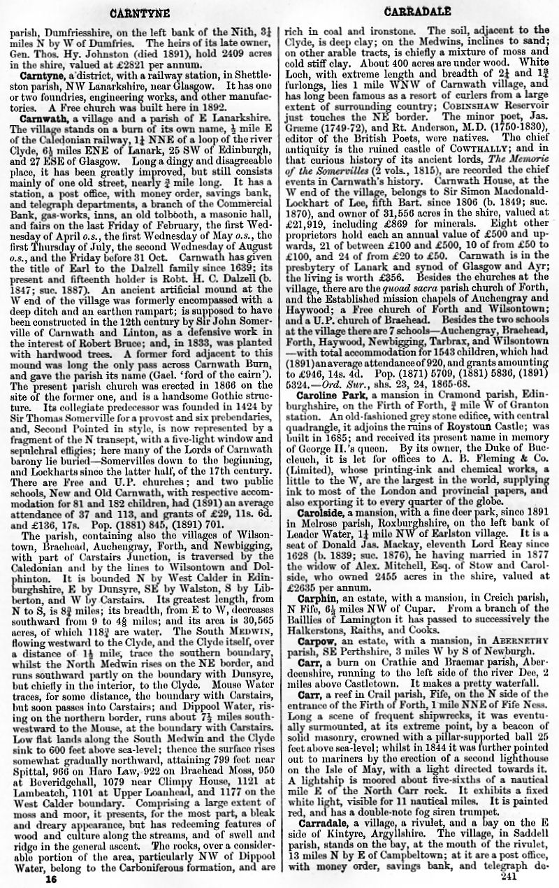 Carntyne, Carnwath, Caroline Park, Carolside, Carphin, Carpow, Carr, Carradale