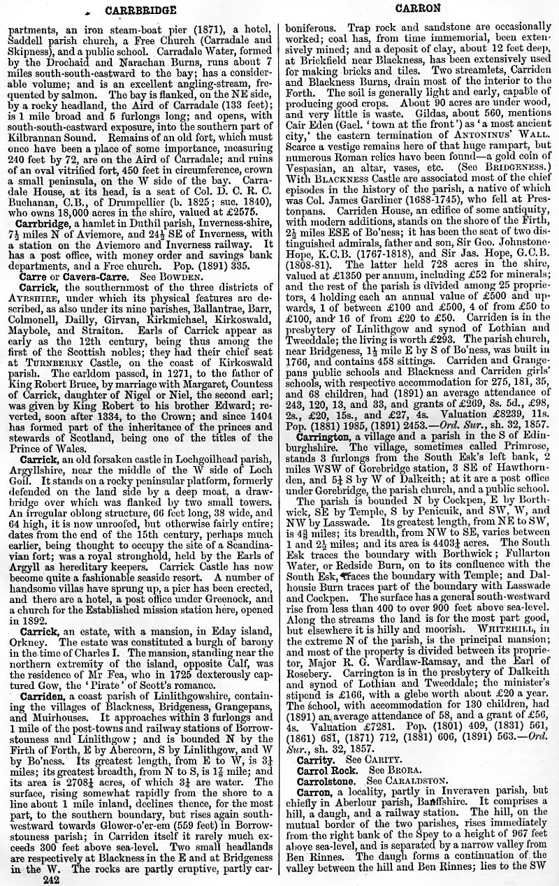 Carrbridge, Carre or Cavers-Carre, Carrick, Carriden, Carrington, Carrity, Carrol Rock, Carrolstone, Carron