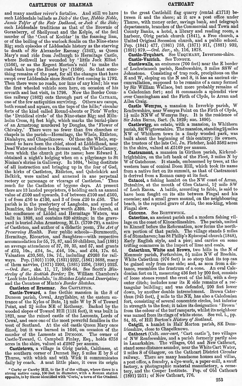 Castleton of Braemar, Castle-Toward, Castletown, Castle-Urquhart, Castle-Varrich, Castlewalls, Castle Wemyss, Castlewigg, Castramont, Catacol, Catcune, Caterline, Caterthun, White and Brown, Catgill, Cathcart
