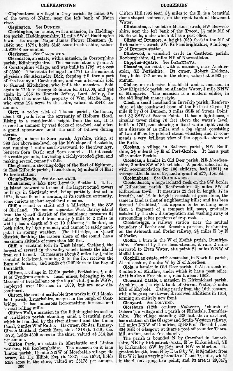 Cloffin, Cloghill, Clola, Cloncaird Castle, Clonyard, Closeburn |