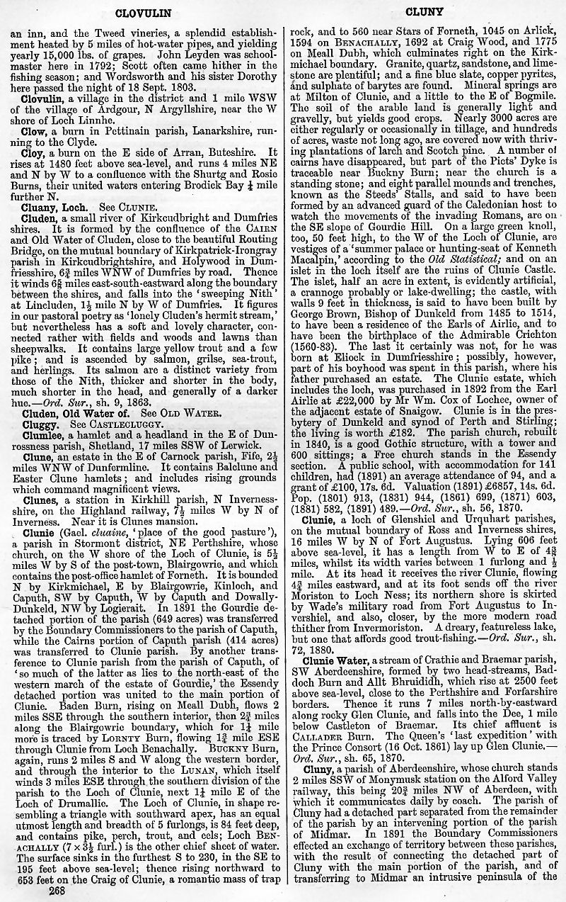 Clovulin, Clow, Cloy, Loch Cluany, Cluden, Old Water of Cluden, Cluggy, Clumlee, Clune, Clunes, Clunie, Clunie Water, Cluny