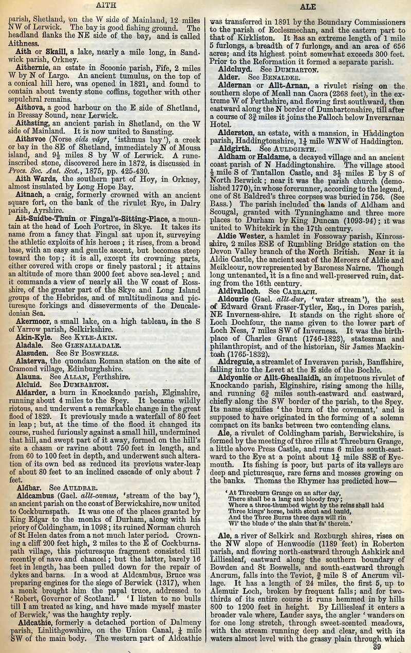 Aldernan or Allt-Arnan, Alderston, Aldgirth, Aldham or Haldame, Aldie