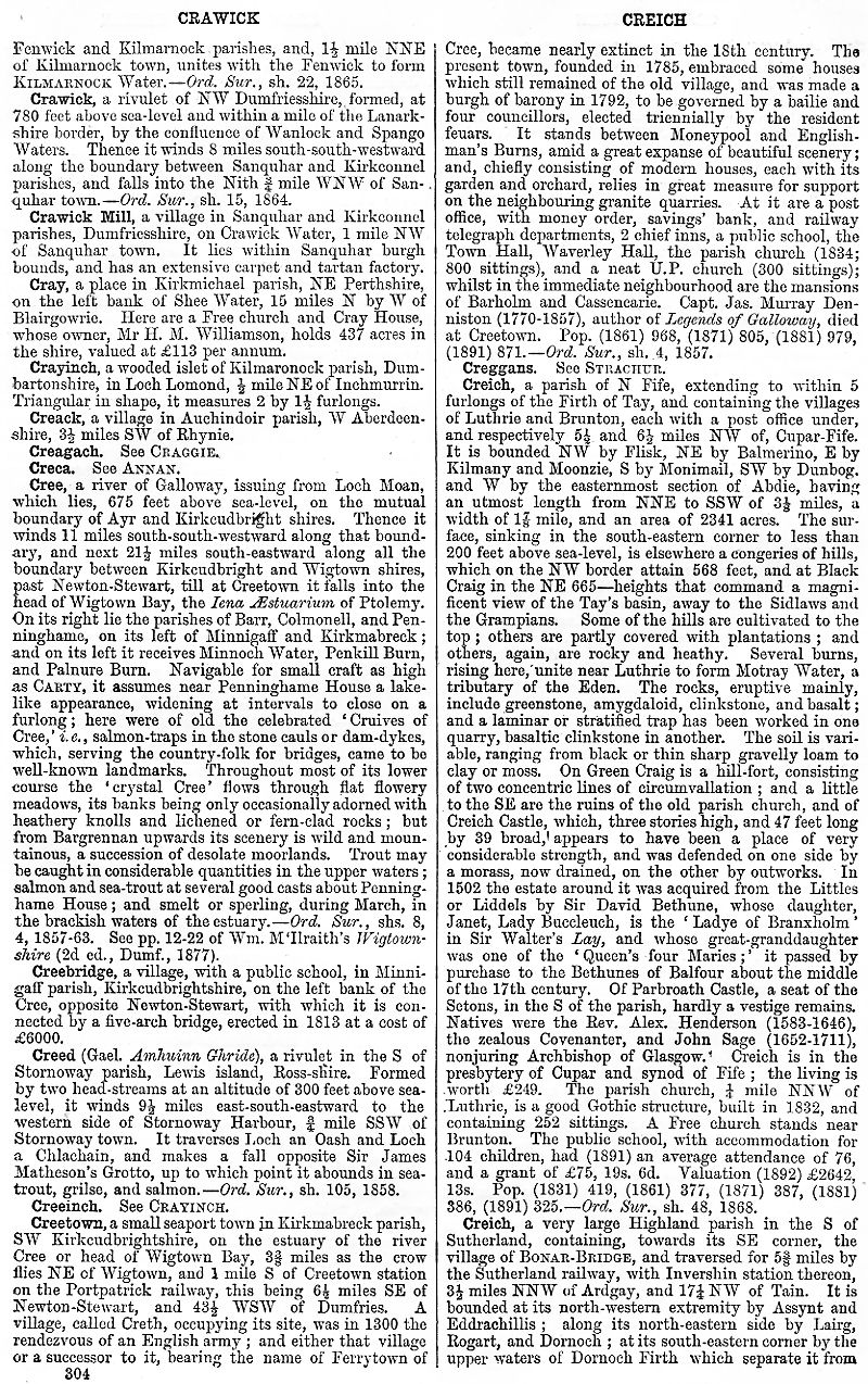 Crawick, Crawick Mill, Cray, Crauinch, Creack, Creagach, Creca, Cree, Creebridge, Creed, Creeinch, Creetown, Creggans, Creich