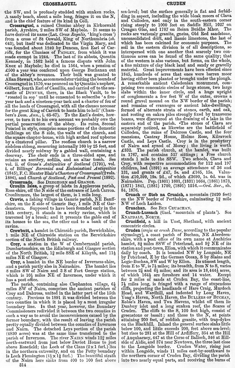Crossraguel, Crossroads, Croulin Isles, Crovie, Crowbutt, Croy, Cruach or Stob na Cruaich, Cruachan, Cruach-Lussach, Crucifield, Cruden