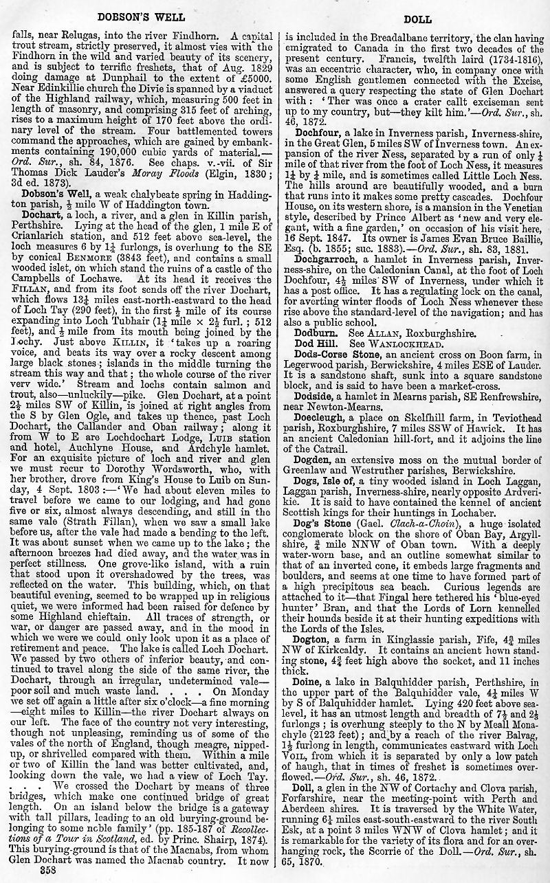 Dobson's Well, Dochart, Dochfour, Dochgarroch, Dodburn, Dod Hill, Dods-Corse Stone, Dodside, Doecleugh, Dogden, Isle of Dogs, Dog's Stone, Dogton, Doine, Doll