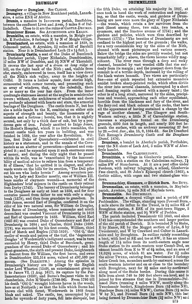 Drumglow, Drumgray, Drumin, Druminnor House, Drumkilbo, Drumlamford, Drumlanrig Castle, Drumlean, Drumlemble, Drumlithie, Drummachloy - Glemore or Ettrick Burn, Drummellan, Drummellie, Drummelzier