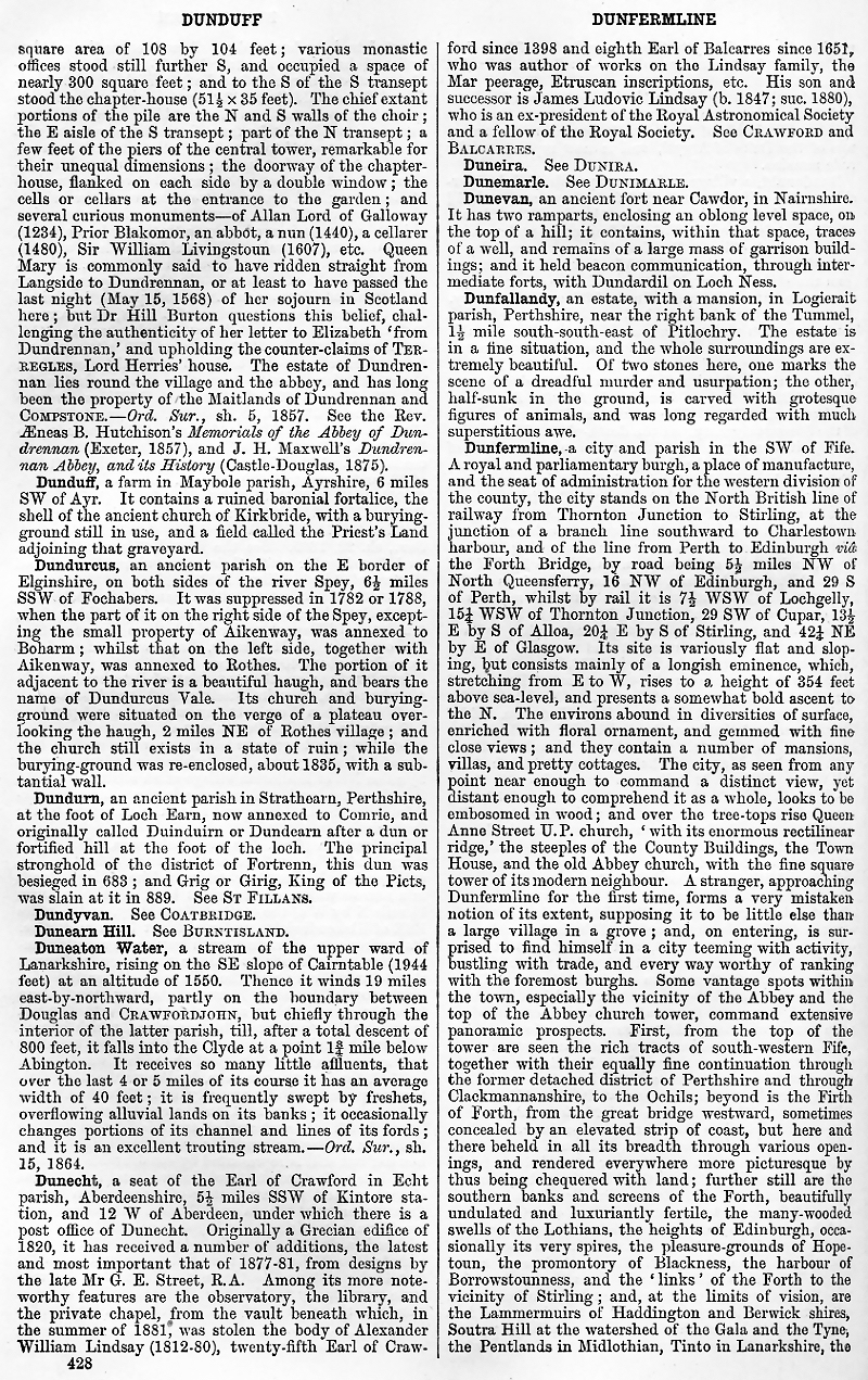 Dundaff, Dundurcus, Dundurn, Dundyvan, Dunearn Hill, Duneaton Water, Dunecht, Duneira, Dunemarie, Dunevan, Dunfallandy, Dunfermline