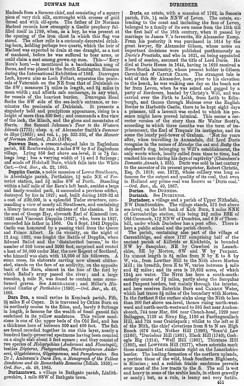 Dunwan Dam, Dupplin Castle, Dura Den, Durhamtown, Durie, Durine, Durinish, Durisdeer