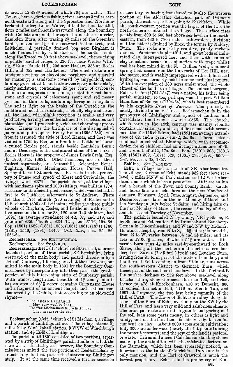 Ecclesfechan, Ecclesgreig, Ecclesiamagirdle, Ecclesmachan, Echline, Echt