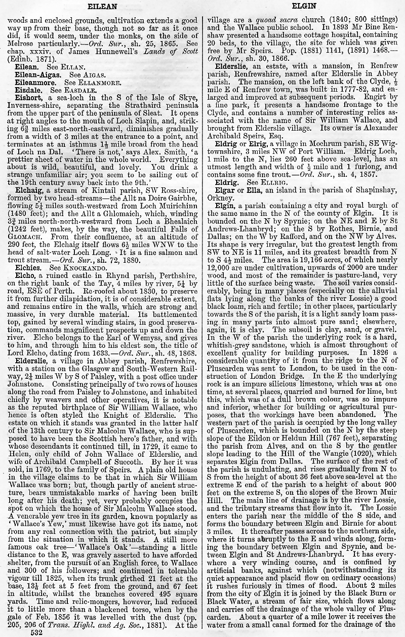 Eilean, Eilean-Aigas, Eileanmore, Eisdale, Eishort, Elchaig, Elchies, Elcho, Elderslie, Eldrig or Elrig, Eldrig, Elgar or Ella, Elgin