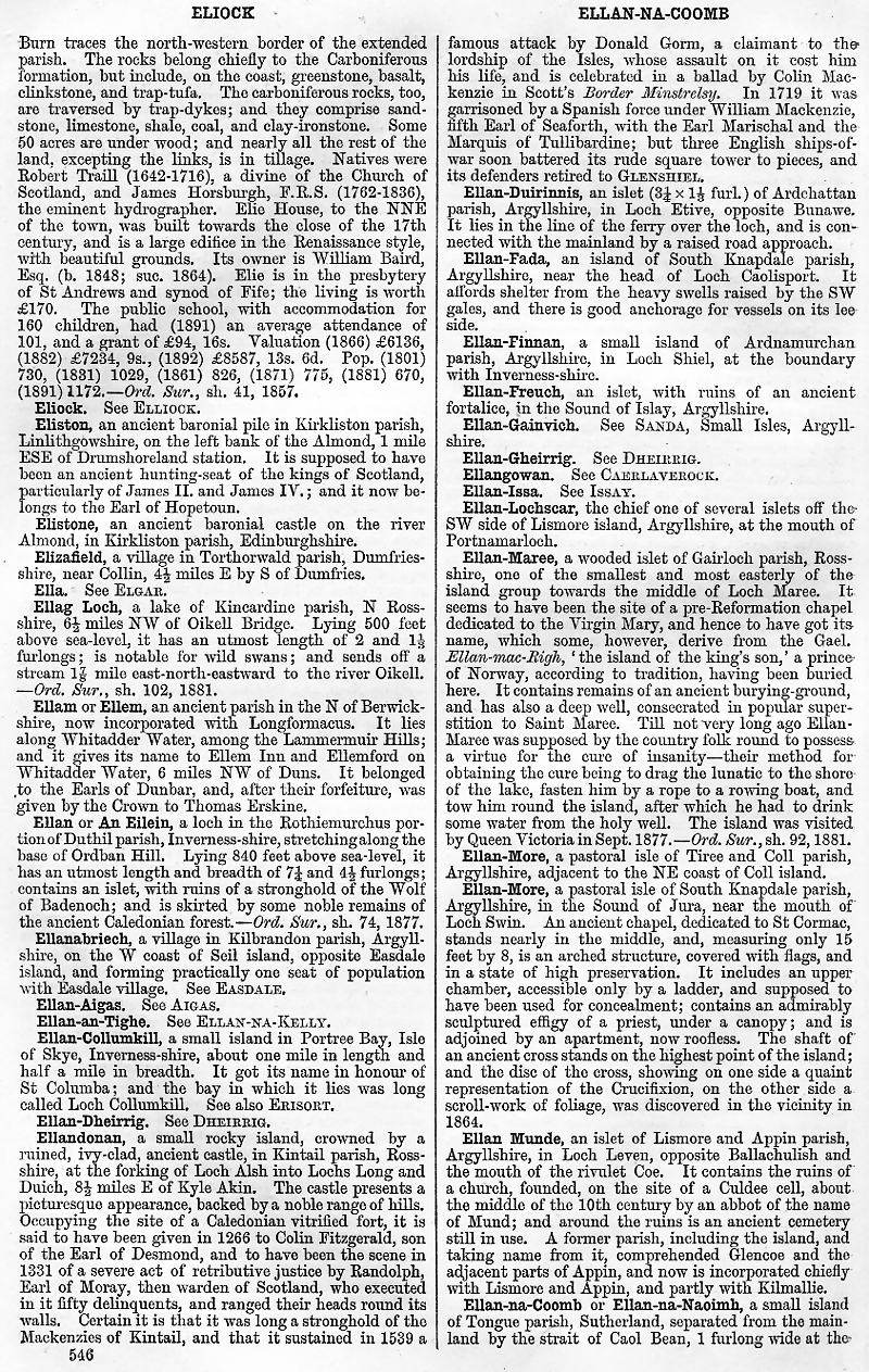 Eliock, Eliston, Elistone, Elizafield, Ella, Ellag Loch, Ellam or Ellem, Ellan or An Eilein, Ellanabriech, Ellan-Aigas, Ellan-an-Tighe, Ellan-Collumkill, Ellan-Dheirrig, Ellandonan, Ellan-Duirinnis, Ellan-Fada, Ellan-Finnan, Ellan-Freuch, Ellan-Gainvich, Ellan-Gheirrig, Ellangowan, Ellan-Issa, Ellan-Lochscar, Ellan-Maree, Ellan-More, Allan Munde, Ellan-na-Coomb or Ellan-na-Macimh