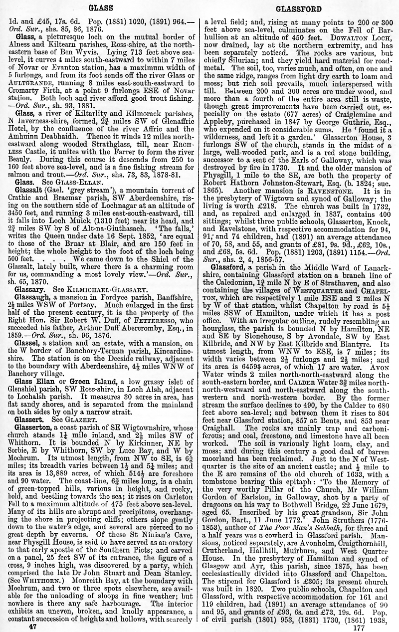 Glass, Glassalt, Glassary, Glassaugh, Glassel, Glass Ellan or Green Island, Glassert, Glasserton, Glassford