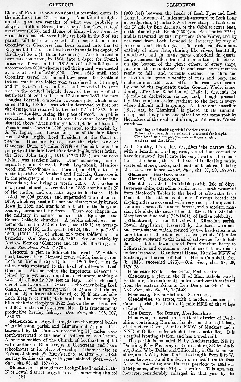 Glencoul, Glencreran, Glencroe, Glencross, Glencul, Glendale, Glendarnel, Glendean's Banks, Glendearg, Glendelvine, Glen Derry, Glendevon