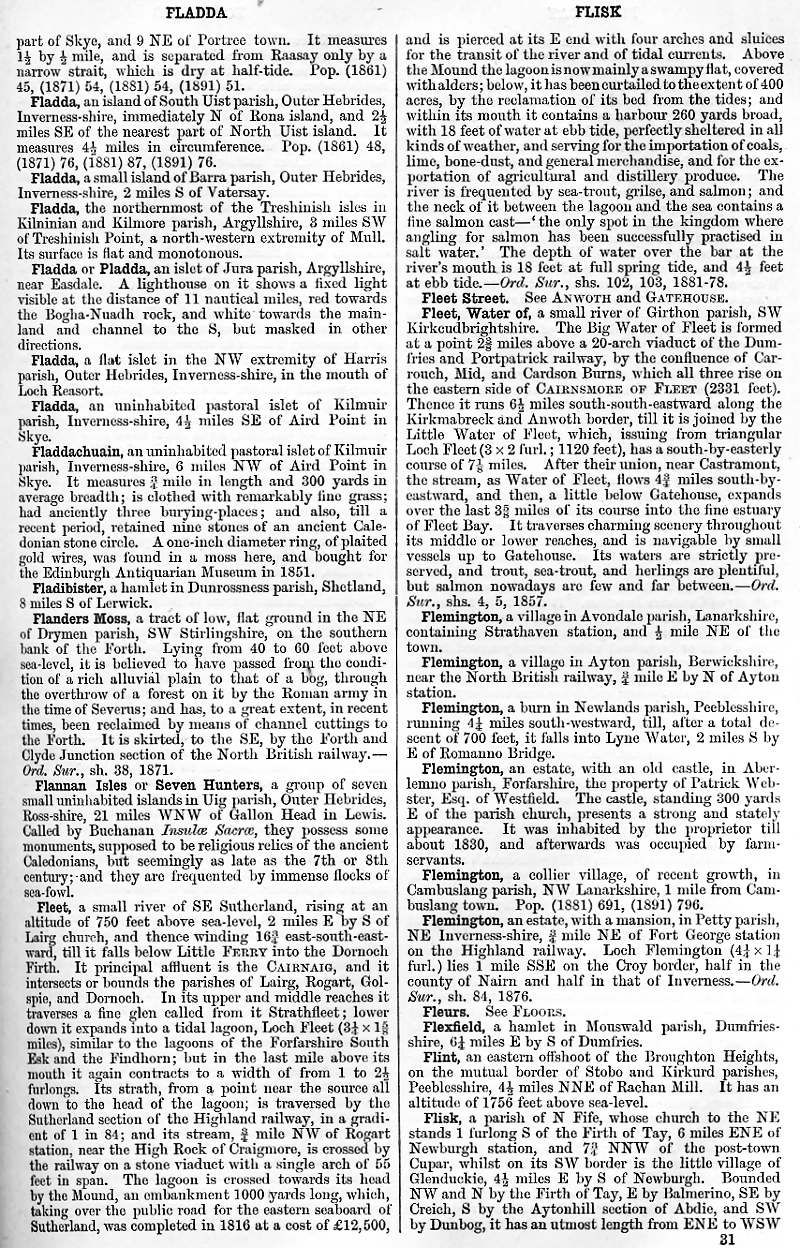 Fladda, Fladda or Pladda, Fladdachuain, Fladibister, Flanders Moss, Flannan Isles or Seven Hunters, Fleet, Fleet Street, Water of Fleet, Flemington, Fleurs, Flexfield, Flint, Flisk