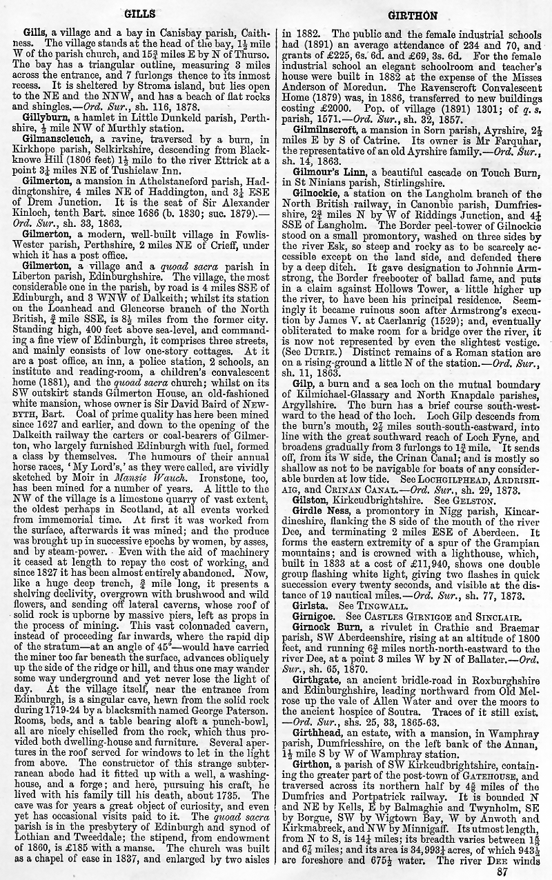 Gills. Gillyburn, Gilmanscleuch, Gilmerton, Gilmilnscroft, Gilmour's Linn, Gilnockie, Gilp, Gilston, Girdle Ness, Girlsta, Girnigoe, Girnock Burn, Girthgate, Girthhead, Girthon