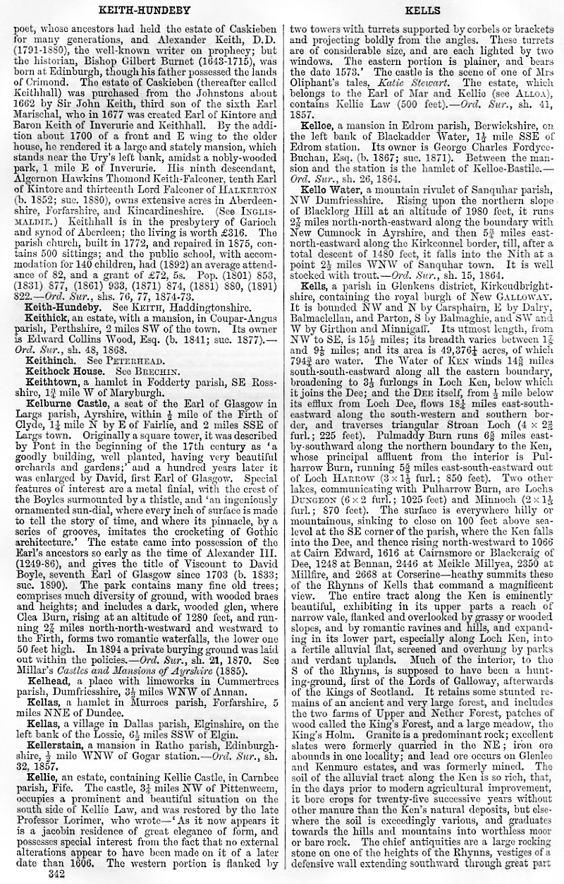 Keith-Hundesby, Keithick, Keithinch, Keithock House, Keithtown, Kelburne Castle, Kelhead, Kellas, Kellerstain, Kellie, Kelloe, Kello Water, Kells