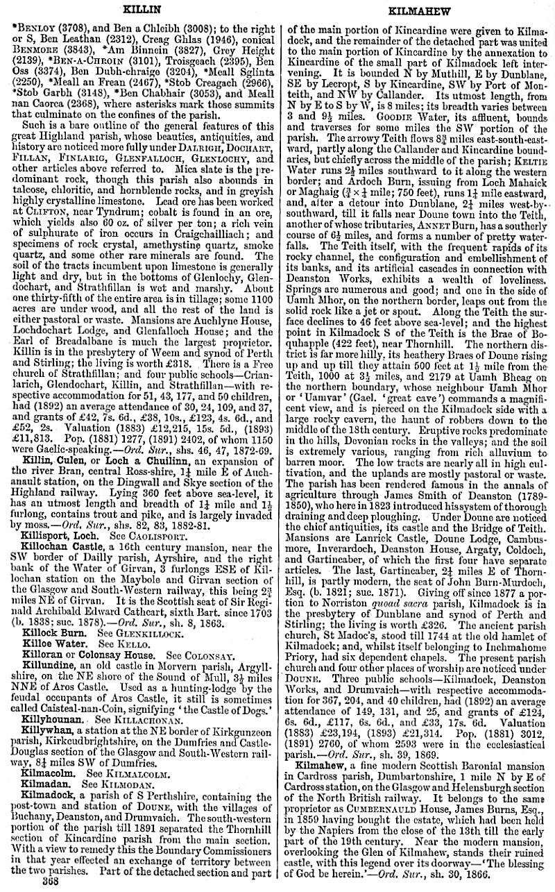 Killin, Culen or Loch a Chuilinn, Loch Killisport, Killochan Castle, Killock Burn, Killoe Water, Killoran or Colonsay House, Killundine, Killyhounan, Killywhan, Kilmacolm, Kilmadan, Kilmadock, Kilmahew