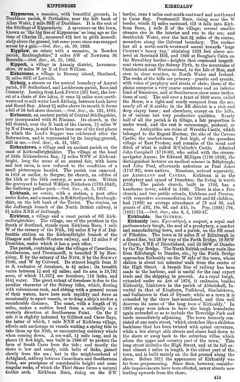 Kippenross, Kippilaw, Kippoch, Kirkabister, Kirkaig, Kirkamuir, Kirkandrews, Kirkbank, Kirkbean, Kirkbuddo, Kirkcaldy