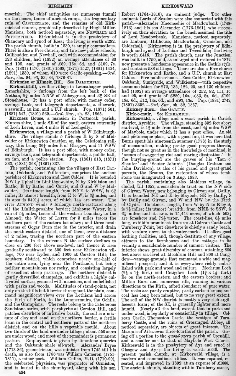 Kirkmien or Kilmein Hill, Kirkmuirhill, Kirkness House, Kirknewton, Kirkney Burn, Kirk-o-muir, Kirkoswald