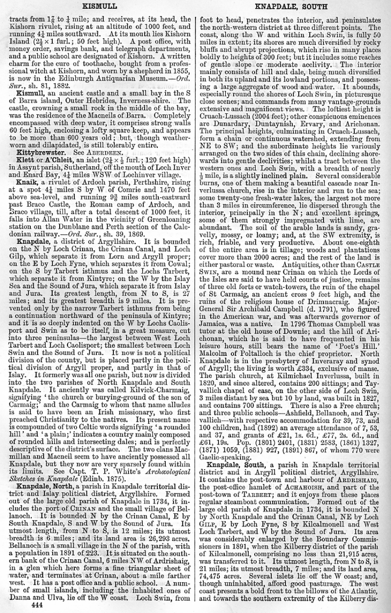 Kismull, Kittybrewster, Klett or A'Chleit, Knaik, Knapdale, North Knapdale, South Knapdale