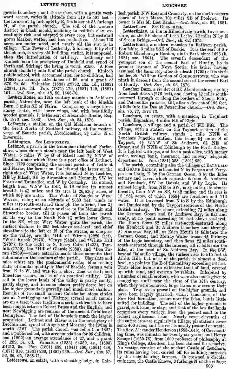 Lethen House, Lethenty, Lethington, Lethnot, Letterewe, Letterfearn, Letterfinlay, Letterfourie, Leuchar Burn, Leuchars
