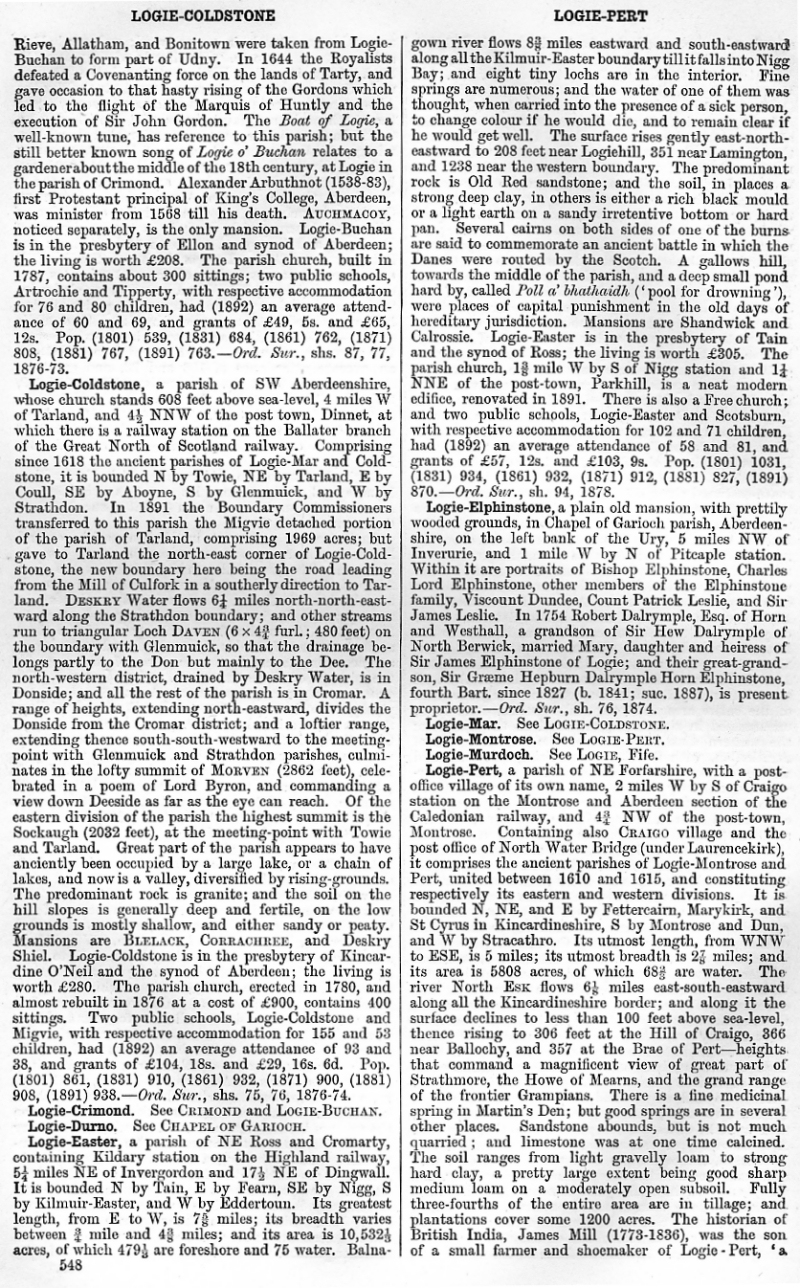 Logie-Coldstone, Logie-Crimond, Logie-Durno, Logie-Easter, Logie-Elphinstone, Logie-Mar, Logie-Montrose, Logie-Murdoch, Logie-Pert