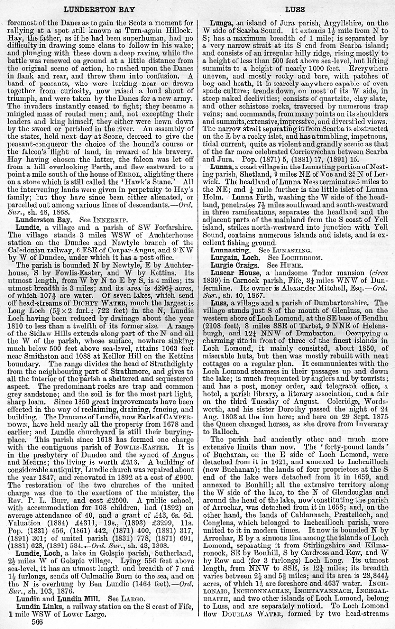 Lunderston Bay, Lundie, Loch Lundie, Lundin and Lundin Mill, Lundin Links, Lunga, Lunna, Lunnasting, Loch Lurgain, Lurgie Craigs, Luscar House, Luss