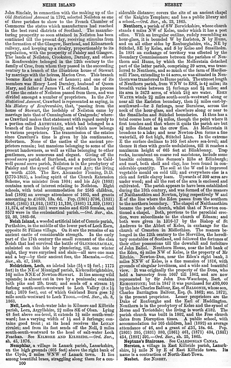 Neish Island, Loch Neldricken, Loch Nell, Nemphlar, Nenthorn, Neptune's Staircase, Nerston, Nesbet
