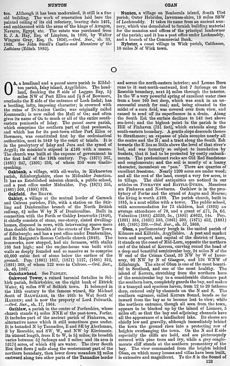 Nunton, Nybsterm Oa, Oakbank, Oakfield, Oakley, Oahshawhead, Oakwood Tower, Oathlaw, Oban