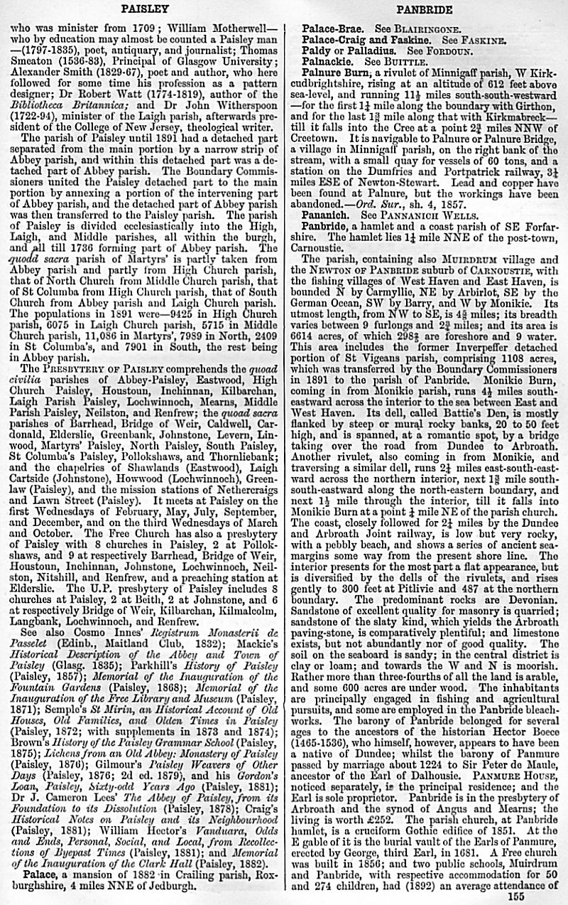 Paisley, Palace, Palace-Brae, Palace-Craig and Faskine, Paldy or Palladius, Palnackle, Palnure Burn, Pananich, Panbride