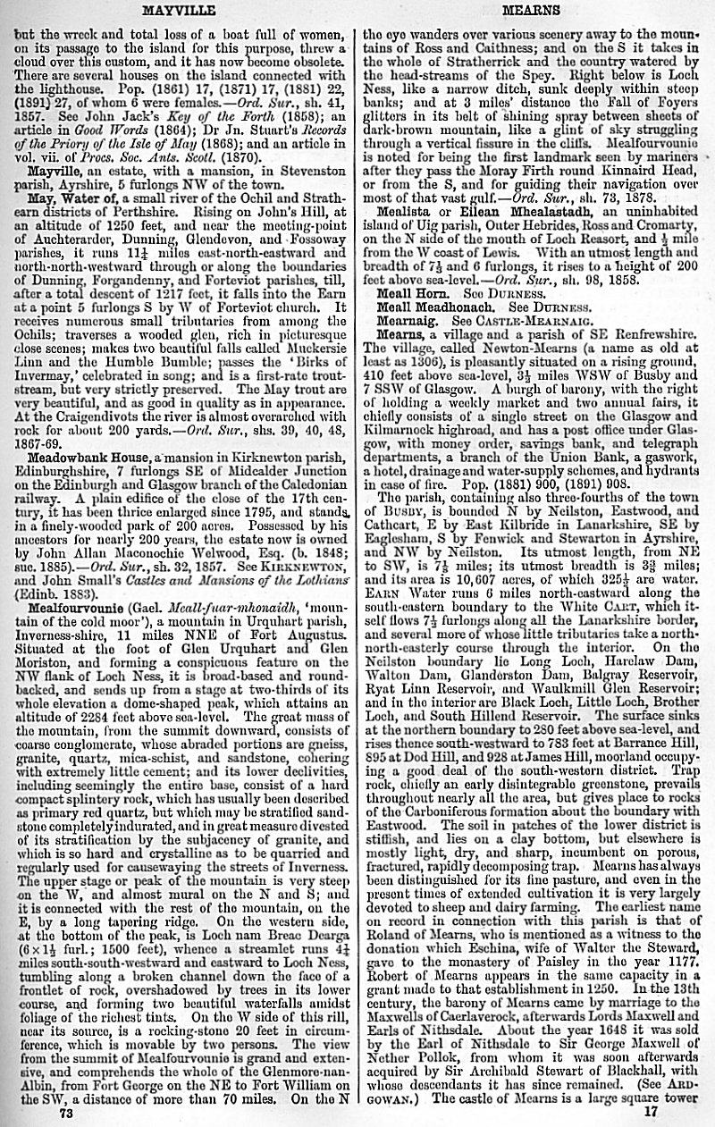 Mayville, Water of May, Meadowbank House, Mealfourvounie, Mealista or Eilean Mhealastadh, Meall Horn, Meall Meadhonach, Mearnaig, Mearns