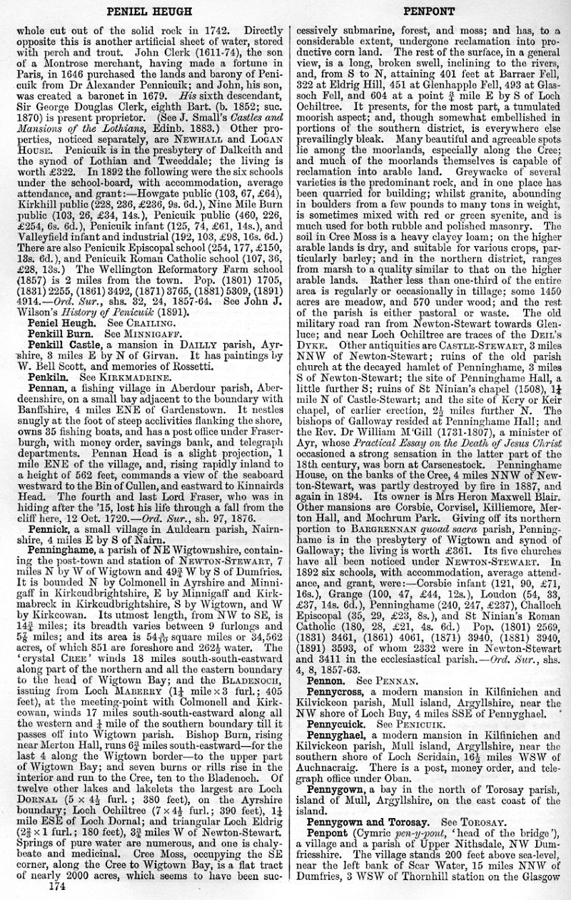 Peniel Heugh, Penkill Burn, Penkill Castle, Penkiln, Pennan, Pennick, Penninghame, Pennon, Pennycross, Pennycuick, Pennyghael, Pennygown, Pennygown and Torosay, Penpont