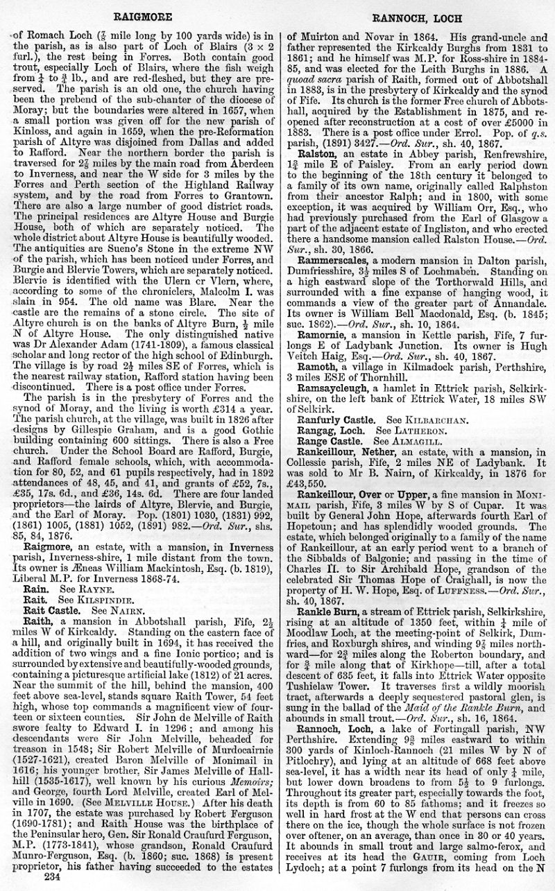 Raigmore, Rain, Rait, Rait Castle, Raith, Ralston, Rammerscales, Ramornie, Ramoth, Ramsaycleugh, Ranfurly Castle, Loch Rangag, Range Castle, Nether Rankeillour, Over or Upper Rankeillour, Rankle Burn, Loch Rannoch