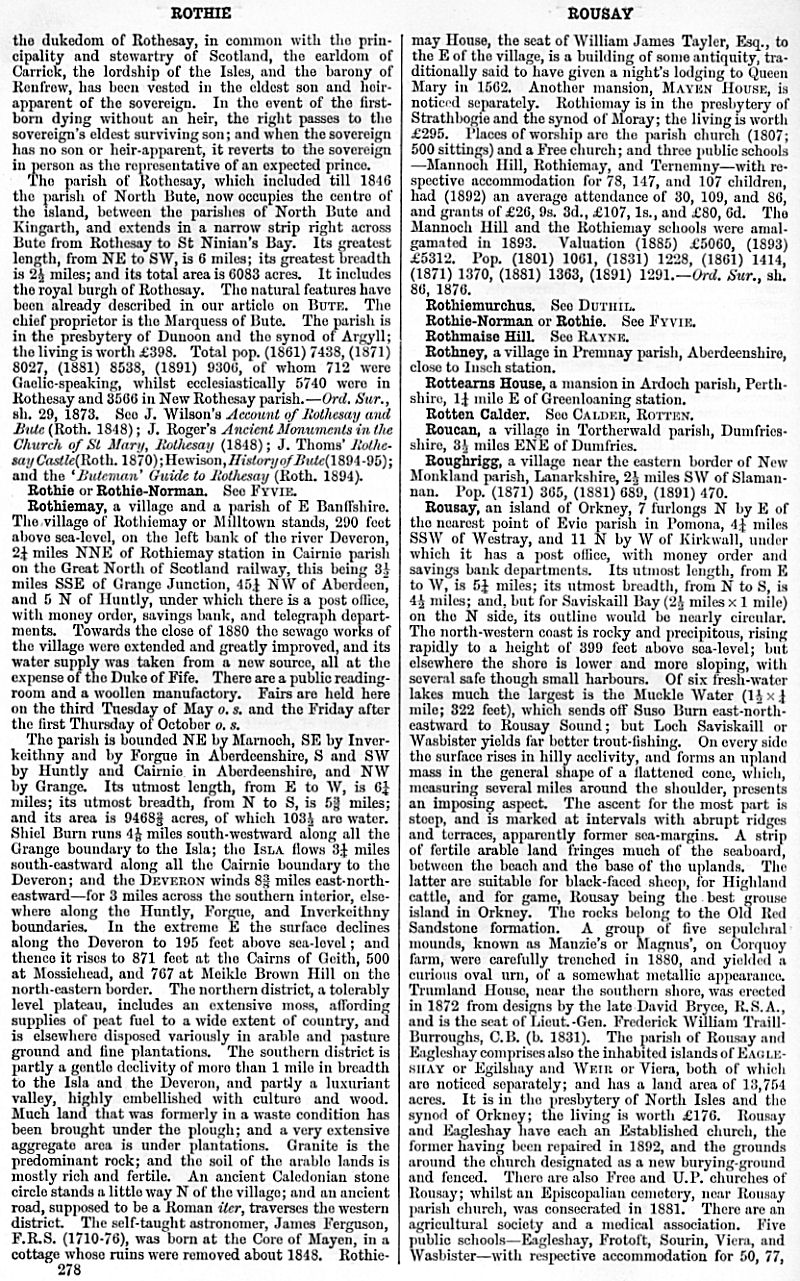 Rothie or Rothie-Norman, Rothiemay, Rothiemurchus, Rothie-Norman or Rothie, Rothmaise Hill, Rothney, Rottearns House, Rotten Calder, Roucan, Roughrigg, Rousay