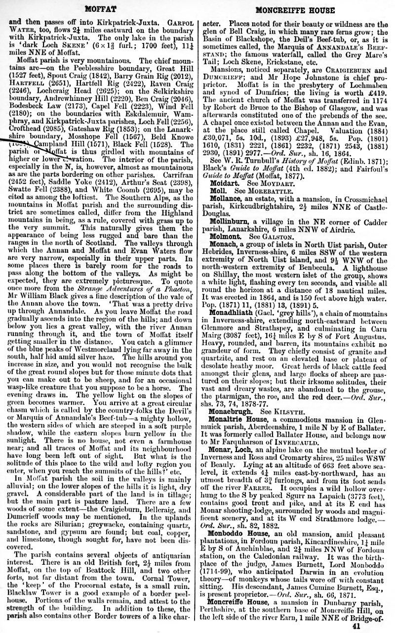 Moffat, Moidart, Moll, Mollance, Mollinburn, Molmont, Monach, Monadhliath, Monaebrugh, Monaltrie House, Loch Monar, Monboddo House, Moncrieffe House