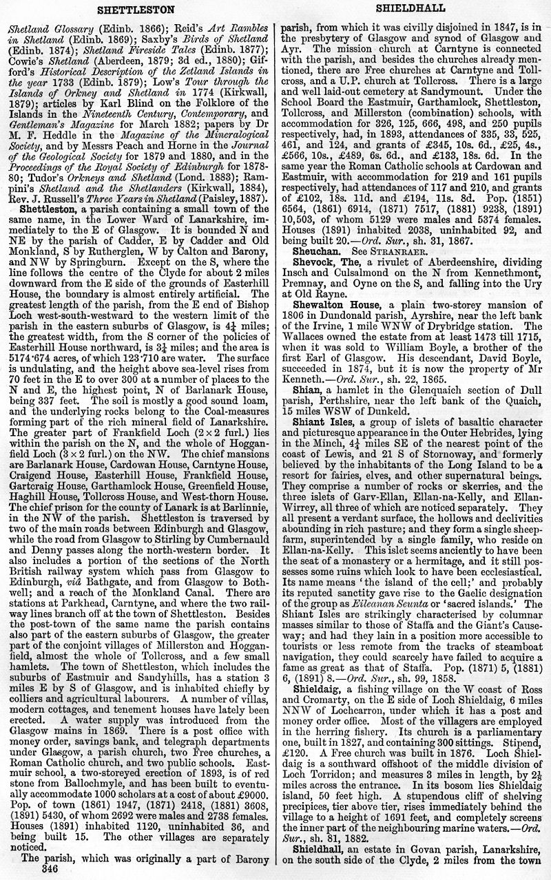 Shetland, Shettleston, Sheuchan, The Shevock, Shewalton House, Shian, Shiant Isles, Sheildaig, Shieldhall