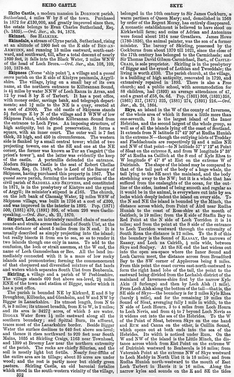 Skibo Castle, Skinnet, Skinsdale, Skipness, Loch Skiport, Skirling, Skye