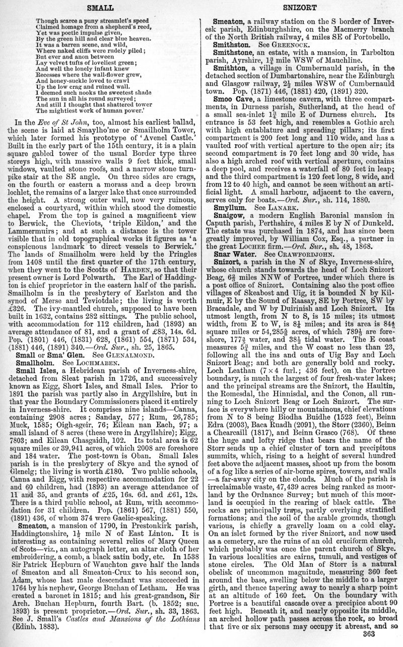 Small or Sma' Glen, Smallholm, Small Isles, Smeaton, Smithston, Smithstone, Smithton, Smoo Cave, Smyllum, Snaigow, Snar Water, Snizort