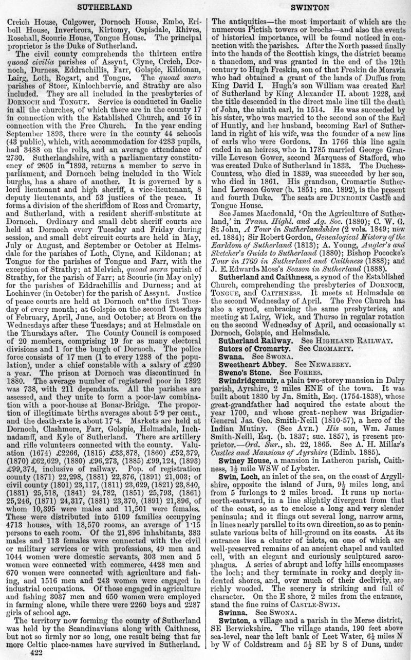 Sutherland, Sutherland and Caithness, Sutherland Railway, Sutors of Cromarty, Swana, Sweetheart Abbey, Sweno's Stone, Swindridgemuir, Swiney House, Loch Swin, Swinna, Swinton