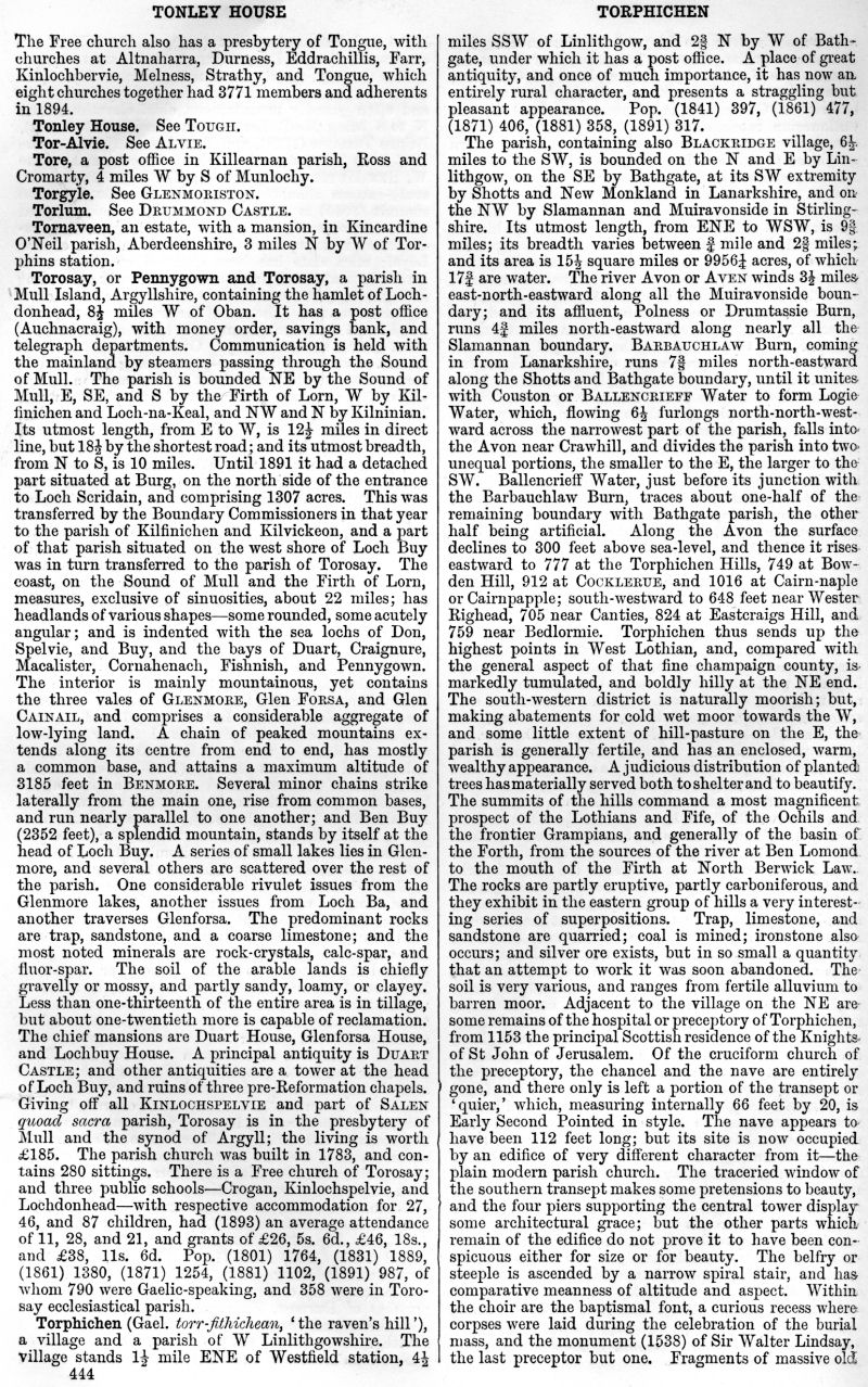 Tonley House, Tor-Alvie, Tore, Torgyle, Torlum, Tornaveen, Torosay or Pennygown and Torosay, Torphichen