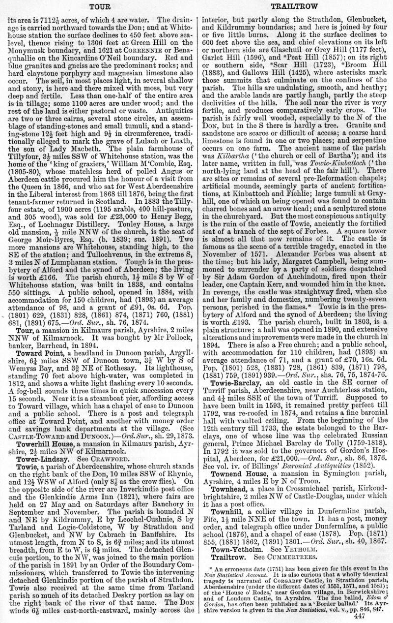 Tour, Toward Point, Towerhill House, Tower-Lindsay, Towie, Towie-Barclay, Townend House, Townhead, Townhill, Town-Yetholm, Trailtrow