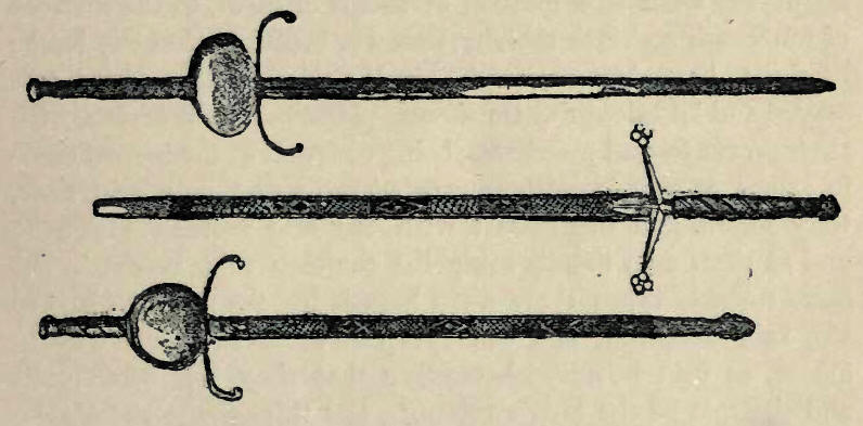 At all these eventful epochs the craftsmen, in their capacity of citizen soldiers, had to play their part. Down to the time of the second rebellion it was imperative that every free craftsman should be fully equipped with the weapons of war. On being admitted a free burgess he had to appear before the Magistrates clad "sufficentlie in armour, with an hagbute, bandaleire [wooden powder case], and sword," as a guarantee that he was able to "watch and ward;" besides having to contribute arms money towards the maintenance of the town's magazine. In token of their prowess at the battle of Harlaw in 1411, tradition says that each of the deacons brought back as a trophy a sword taken from the enemy. Three of the crafts—the Hammermen, the Tailors, and the Weavers—have still in their possession swords which are said to be the veritable weapons brought back from Harlaw, and their make and appearance do not belie the tradition.