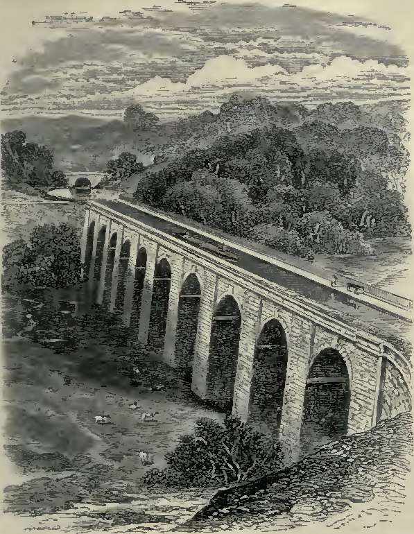 The heaviest and most important part of the undertaking was in carrying the canal through the rugged country between the rivers Dee and Ceriog, in the vale of Llangollen. From Nantwich to Whitchurch the distance is 16 miles, and the rise 132 feet, involving nineteen locks; and from thence to Ellesmere, Chirk, Pont-Cysylltau, and the river Dee, 1 3/4 mile above Llangollen, the distance is 38 1/4 miles, and the rise 13 feet, involving only two locks. The latter part of the undertaking presented the greatest difficulties; as, in order to avoid the expense of constructing numerous locks, which would also involve serious delay and heavy expense in working the navigation, it became necessary to contrive means for carrying the canal on the same level from one side of the respective valleys of the Dee and the Ceriog to the other; and hence the magnificent aqueducts of Chirk and Pont-Cysylltau, characterised by Phillips as "among the boldest efforts of human invention in modem times."*[2] The Chirk Aqueduct carries the canal across the valley of the Ceriog, between Chirk Castle and the village of that name. At this point the valley is above 700 feet wide; the banks are steep, with a flat alluvial meadow between them, through which the river flows. The country is finely wooded. Chirk Castle stands on an eminence on its western side, with the Welsh mountains and Glen Ceriog as a background; the whole composing a landscape of great beauty, in the centre of which Telford's aqueduct forms a highly picturesque object.