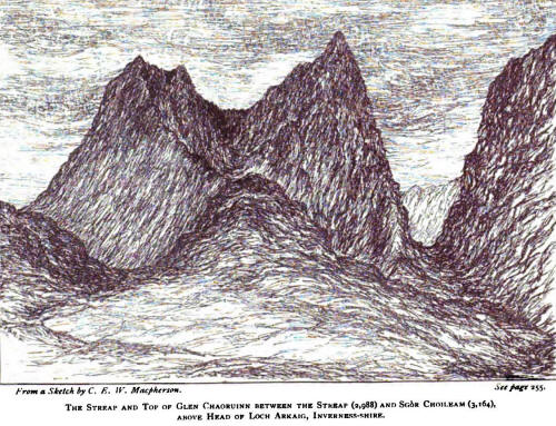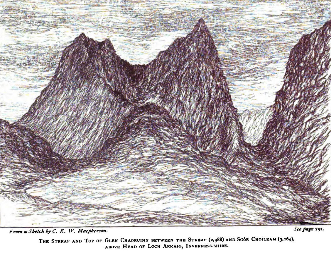 We met by appointment at Fort-William, and first left the main road at Fassfern on the north shore of Loch Eu, five miles west of Corpach, intending to push on to Inverie, on Loch Nevis, by a route described in Anderson's old "Guide to the Highlands." The route crosses four distinct high mountain passes. The first is from the head of the north-west branch of the Suileag stream, up above whose north side, on the slope of the big round Meal Onfhaidh hill, the path is fairly well marked, more so at the actual "col" as is usual in these Scotch hill passes, the whole occasional traffic of centuries being there confined to almost one possible way through. The view opening away to the west, across Glen Fionn, to which we descended, was a striking panorama of mountain peaks. The crossing of the Fionn was our first difficulty and perhaps naturally so, as it was our first entry into deer forest. The gradually vanishing path took us to an ancient wooden bridge, but of so unstable, rickety, and long unused appearance that we dared not venture our lives upon it. We therefore forded at foot of the gully over which it went, and ascended the east side of the Choire Reidh Water, which flows down through a delightful green pastoral valley apparently given wholly up to deer. The next crossing was out of this glen, by the high steep "Panting Pass" (2,000 ft.), west of the Gulvain mountain, and down to the head of Glen Camaraidh. To top of this fine pass the track was fairly visible, but there it seemed to come to an end. A little way east was the fatal slope where the unfortunate young Earl of Dalkeith had met his sad fate so recently. Far down the glen the head of Loch Arkaig glistened in the sunshine. But not a sign of life around! Not even the cry of a grouse or a curlew disturbed that immense and almost melancholy solitude. We steered W.N.W., and descended to near the 1,000 feet level, and then climbed out of Camaraidh and over to foot of Glen Pean. In this crossing we again come on traces of our road, and have some most wonderfully picturesque views of the strangely sharp and rugged "aiguilles" of Streap and Sgôr Choileam, two of the most remarkably shaped hills in Scotland, near at hand to the west ; as also of the higher Inverness-shire mountains in the north. In Glen Pean we were away from deer among the sheep once more, and so we actually met a MAN, who rather marvelled at our journey, but wished us good speed thereon! Then in Glen Dessary more men, a sheep shearing, a score or so of collies, and a substantial afternoon tea at the shepherd's house. (Oh, ye gods! these scones and that butter! Even now, four years after, the grateful memory of them is sweet.)