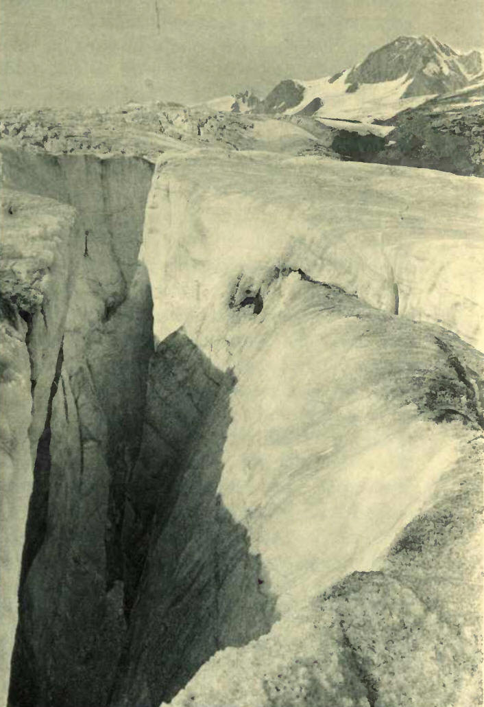 Lingering a while and sauntering about in sight of the shore, I found this eastern side of the glacier remarkably free from large crevasses. Nearly all I met were so narrow I could step across them almost anywhere, while the few wide ones were easily avoided by going up or down along their sides to where they narrowed. The dismal cloud ceiling showed rifts here and there, and, thus encouraged, I struck out for the west shore, aiming to strike it five or six miles above the front wall, cautiously taking compass bearings at short intervals to enable me to find my way back should the weather darken again with mist or rain or snow. The structure lines of the glacier itself were, however, my main guide. All went well. I came to a deeply furrowed section about two miles in width where I had to zigzag in long, tedious tacks and make narrow doublings, tracing the edges of wide longitudinal furrows and chasms until I could find a bridge connecting their sides, oftentimes making the direct distance ten times over. The walking was good of its kind, however, and by dint of patient doubling and axe-work on dangerous places, I gained the opposite shore in about three hours, the width of the glacier at this point being about seven miles. Occasionally, while making my way, the clouds lifted a little, revealing a few bald, rough mountains sunk to the throat in the broad, icy sea which encompassed them on all sides, sweeping on forever and forever as we count time, wearing them away, giving them the shape they are destined to take when in the fullness of time they shall be parts of new landscapes.